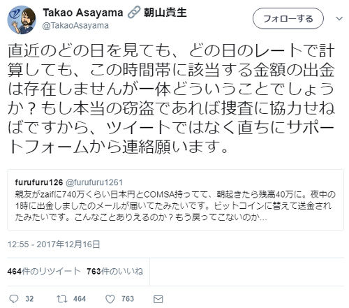 そのような報告が12月15日の11時頃にツイートされており話題になっている。その投稿をみた『Zaif』の社長である朝山貴生氏が