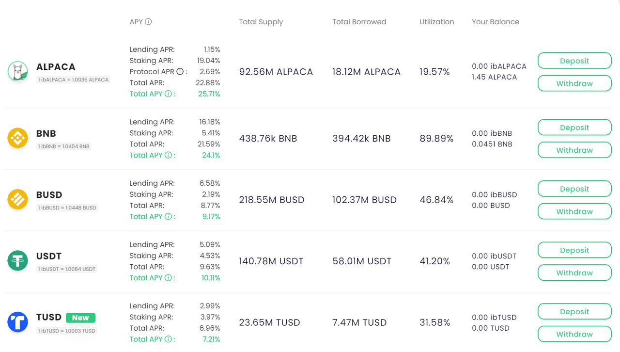 こちらもDeFiですが、資産を貸し出すと、通常の利息とは別にALPACAというトークンを獲得することができます。こちらも含めてUSDTを年利10.11%で貸し出すことができます。