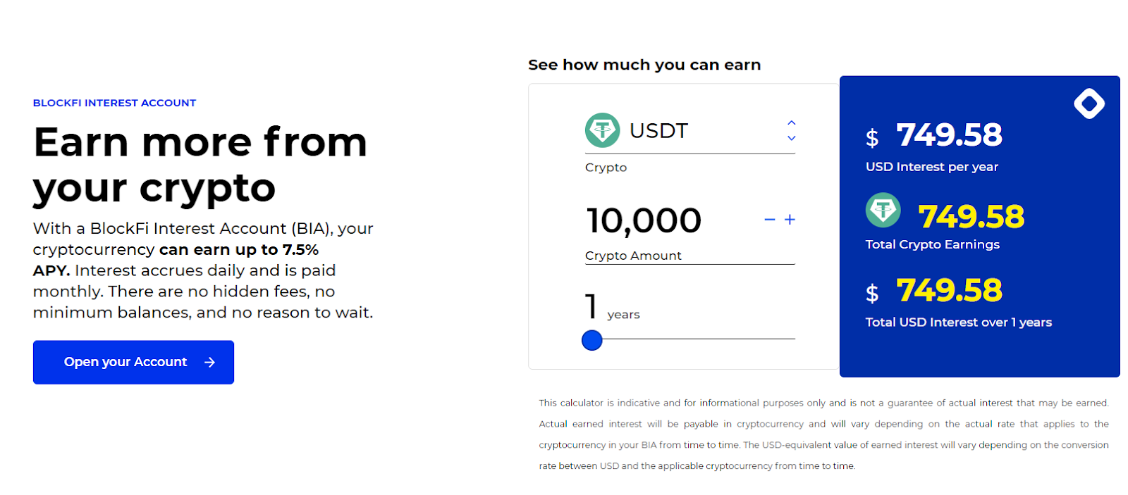 例えば、BlockFiで、10,000 USDTを貸し出すと1年間で約750ドルの利息を得ることができます。
