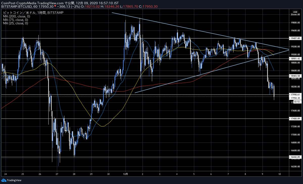 【価格アラート】 ビットコイン(BTC)が急落。一時17,000ドル台突入で主要アルトも一段安に。