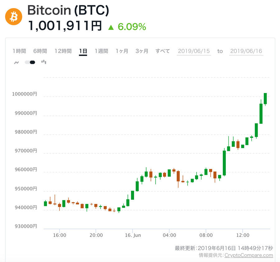 世界最大の時価総額を有するビットコインは2019年6月16日14時49分(日本時間)現在、