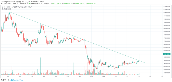 ビットコイン(BTC)は午後1時半付近から急激に価格が高騰し、