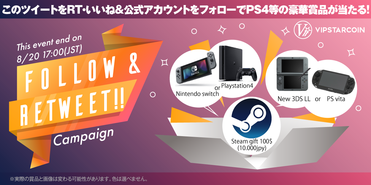 Twitterで公式アカウントhttps://twitter.com/VIPSTARCOIN をフォローして、以下のツイートをリツイートしよう!