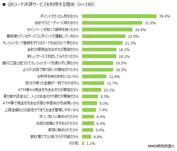 QRコード決済を利用する理由は、トップが「ポイントがたくさん貯まるから」で39.4%に上った。次いで「会計がスピーディーに終わるから」(31.9%)、「キャンペーンを知って興味を持ったから」(26.6%)という回答だった。