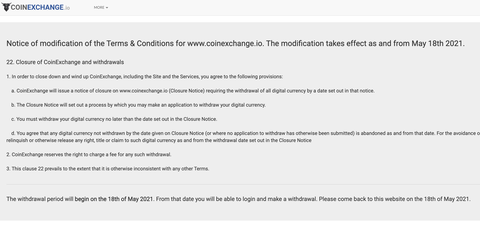 CoinExchange.ioは2018年以降の下落相場に影響され取引所を運営する業務コストが収入を大幅に上回っていたとして、事業体制の維持が難しくなった。2019年10月に事業撤退の方針を伝え、仮想通貨取引と入金を同年10月15日に終了させていた。