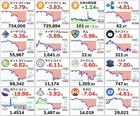 ビットコイン暴落、100万円を大幅に割り込む 仮想通貨 X Facebook はてブ Pocket LINE コピー 2020.05.22 仮想通貨ビットコインは、23:40頃にかけて一時前日比-8%近く暴落。96万円(8,900ドル)台まで下落した。21日時点で105.7万円を推移してたが、2日間で10万円幅値を下げた形となる。 Source: 仮想通貨まとめNEWS