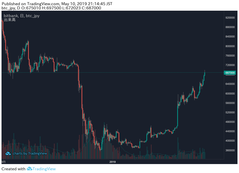 【速報】ビットコイン(BTC)価格|70万円間近まで大幅上昇!上昇トレンドがさらに先鋭化