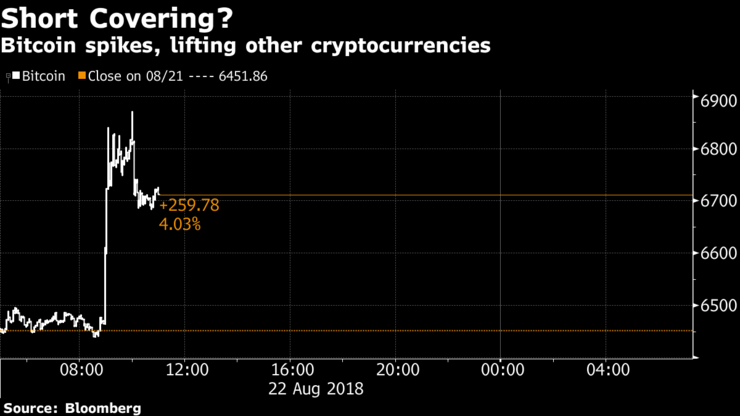 ブルームバーグの総合価格データによれば、ビットコインは香港時間午前9時(日本時間同10時)に6465ドル前後から急伸し始め約7分で6840ドルに到達。11時3分現在は6710ドルと、2週間ぶりの高値付近で推移している。ただ年初来では53%の値下がり。
