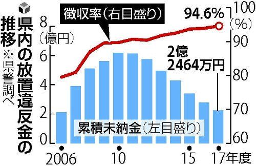県警によると、県内の放置違反金の徴収率は、対策の強化に伴い、06年度の79・5%から年々上昇。17年度は過去最高の94・6%となり、1年間で約7億3600万円を回収した。