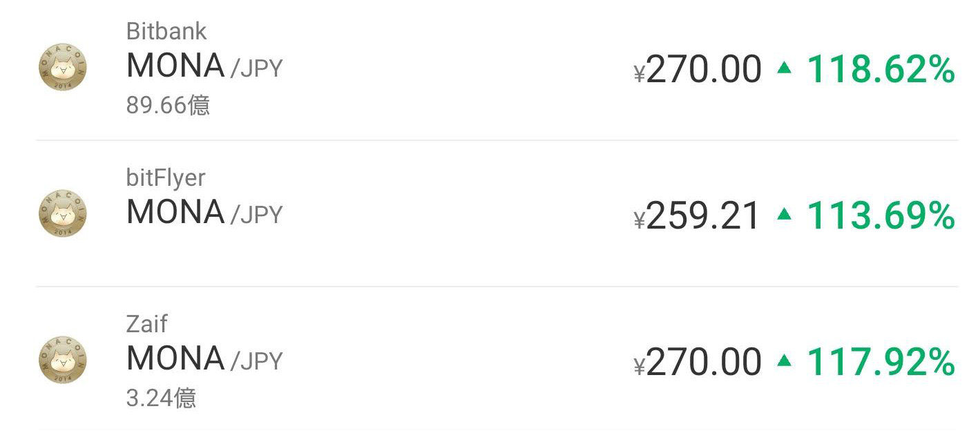 それまで1MONA=117円~119円台で推移していたが、2倍超の急騰を見せ、17時35分現在、bitFlyerでは260円、Bitbankでは270円、Zaifでは269円まで価格が上昇した。