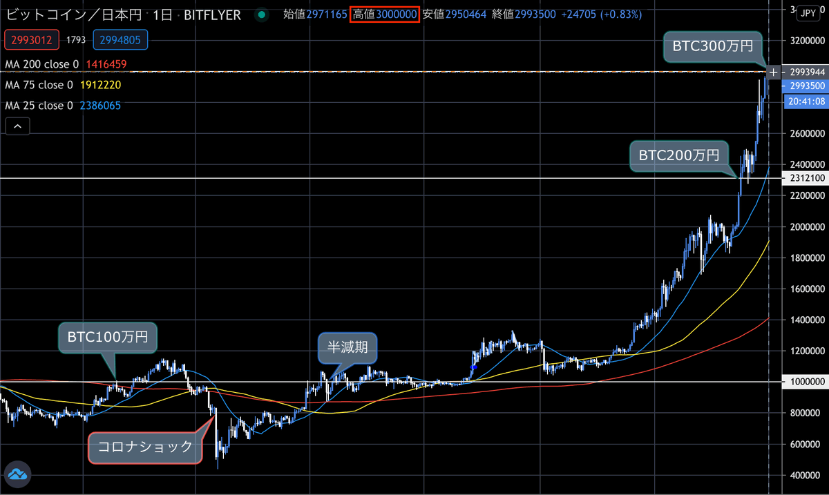 2021年1月1日、国内大手取引所bitFlyerのビットコイン(BTC/JPY)現物価格が、過去最高値の300万円台に到達した。