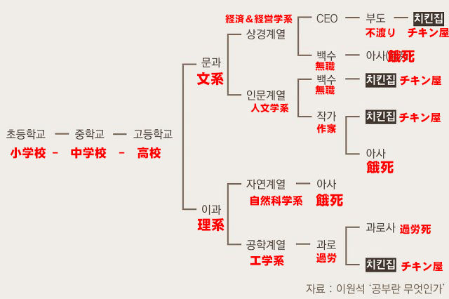 韓国メディアの東亜日報がチキン屋の実態を報じた。学歴が高卒であればどのに行こうが最終的にはチキン屋になるか餓死するか過労死するというチャートを纏めたもの。このチャートは一時期韓国のネットで話題となった風刺だが、専門家曰く「だいたいあってる」とのことだ。