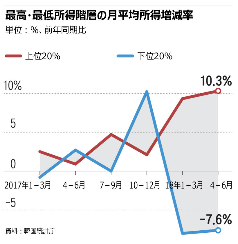 「雇用政府」「所得主導成長」を掲げる文在寅(ムン・ジェイン)政権下で、雇用情勢の悪化に続き、貧富の格差が前例のないペースで広がり、「所得ショック」まで発生している。