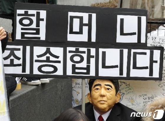 20日午後、ソウル鍾路区の旧日本大使館前で開かれた日本軍性奴隷制問題解決のための『第1375次定期水曜集会』で、ある参加者が安倍日本総理の仮面を付けている。