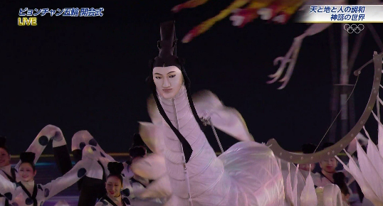 選手入場前に行われたセレモニーは、韓国の神話をモチーフとした幻想的な雰囲気で行われた。すると突然、人間の顔をした巨大な鳥が登場した。実は、韓国では神話に出てくる平和な時代にしか現れない不死鳥の元になっており、平和の祭典という五輪の開会式に起用されたもの。