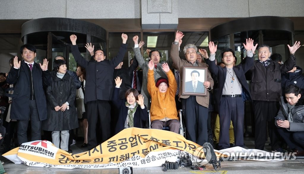 11月29日、日本による植民地時代だった戦時中に三菱重工業で働かされた韓国人被害者が同社を相手取り起こした損害賠償請求訴訟の上告審で、同社に賠償を命じる判決が出たことを受けて喜ぶ原告と家族ら=(聯合ニュース)