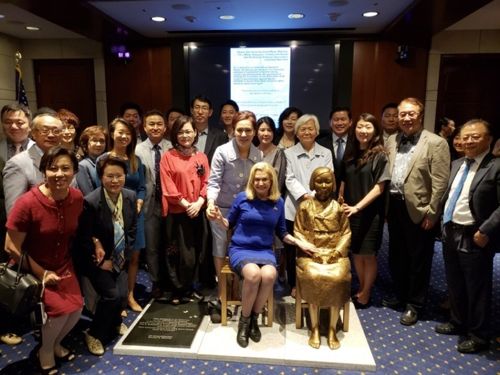 7日、アメリカ,ワシントンDC連邦議会訪問者センターで行われた『平和の少女像』展示会の参加者が記念撮影をした。少女像の左側はキャロライン・マルロニー(民主・ニューヨーク)連邦下院議員であり、その左側は展示行事を主管したキム・ミンソン,ニューヨーク韓人会長。