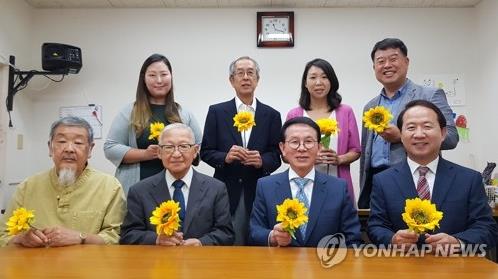 ▲ ヘイトスピーチを許さない『かわさき市民ネットワーク』の関田寛雄会長(90歳=前列左から2番目)がペ・ジュンモ(チョング社理事長)、ミン・ビョンチョル(ソンプル財団ソンプル運動本部)、ミン・ビョンド(スカウト会長)と記念撮影をしている。