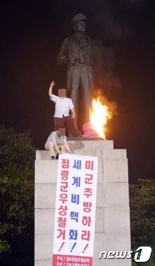 3人は同日午前2時ごろ、はしごを使って高さ4メートルの銅像台座に登り、「私は大韓民国の牧師として民族分断の悲劇をもたらした戦争詐欺師マッカーサーの偶像をもう容赦できない」と叫んで像の足元に布団を巻き付け、火をつけた。また、「占領軍偶像撤去! 世界非核化! 米軍を追放せよ!」と書いた垂れ幕を出して台座の上でスローガンを叫び、降りた。