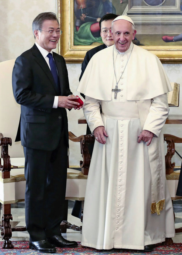 南北融和に前のめり姿勢の文大統領(左)。10月にはローマ法王に訪朝を要請した=聯合・共同