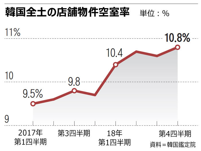 延世大の成太胤(ソン・テユン)教授は「景気低迷と通販普及で売り上げが減少している上、人件費などのコストが上昇し、自営業者が廃業している。その結果が空室率の上昇、賃料下落という形で表れている」と指摘した。