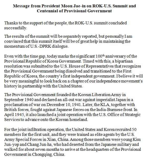 「国民の声援に力づけられて韓米首脳会談を成功裏に終えた」とし「朝米間の対話力の維持に大きな助けになるだろう」と自評した。