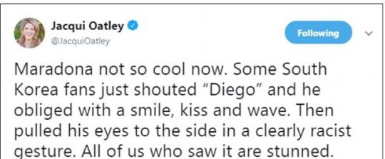 「ディエゴ・マラドーナが韓国ファンたちに向かって明らか人種差別ジェスチャーを取った疑いを受けている」と書いた。