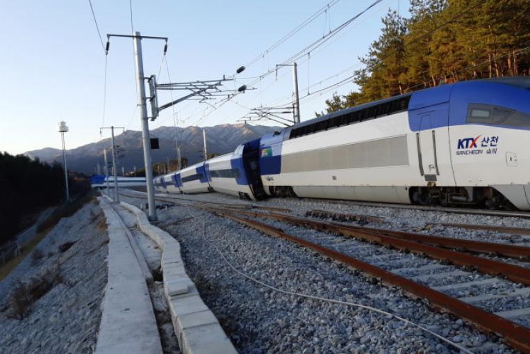 【ソウル時事】韓国国土交通省によると、北東部の江原道・江陵で8日午前7時35分(日本時間同)ごろ、高速鉄道KTXの車両が脱線した。江原道消防本部によれば、14人が打撲などの軽傷で手当てを受けた。在韓日本大使館によると、負傷者に日本人は含まれていない。以下略