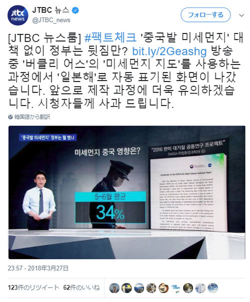 その指摘を受けたJTBC放送局は「中国の大気汚染問題を報じている際に自動的に日本海と表記された地図が