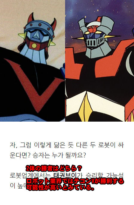 この2体のロボットを見てロボット業界ではテコンVが勝利する可能性が高いと見られている。その理由はテコンVの操作方法にあり、ジョンジェスン教授は「テコンVは主人公が考えた通りに操作可能で、マジンガーZよりも先に行動可能」と説明。