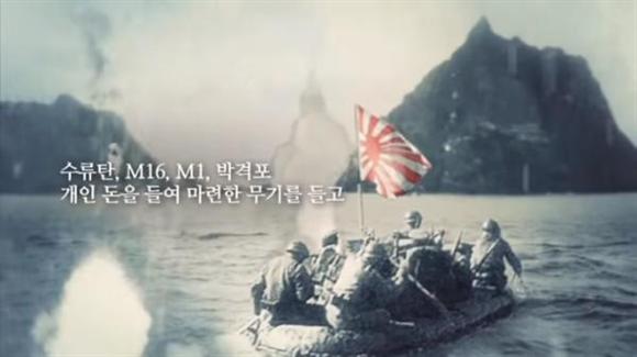 同じKBSの番組予告編で使われた写真。やはり旭日旗を掲げて竹島を目指す日本軍らしき一団が見える。これは、1939年のノモンハン事件で「渡河作戦を実行中の日本軍」とされる写真が使われたことが判明した。日の丸を旭日旗に改竄し、竹島を合成している。