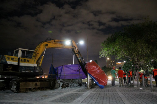 近くの売店員によると、マニラ市職員と名乗る作業員が27日夜、ショベルカーなどを使って像を撤去。台座や記念碑板なども丁寧に外され、一緒に持ち去られた。作業員は「水道管の修理」と話していたという。