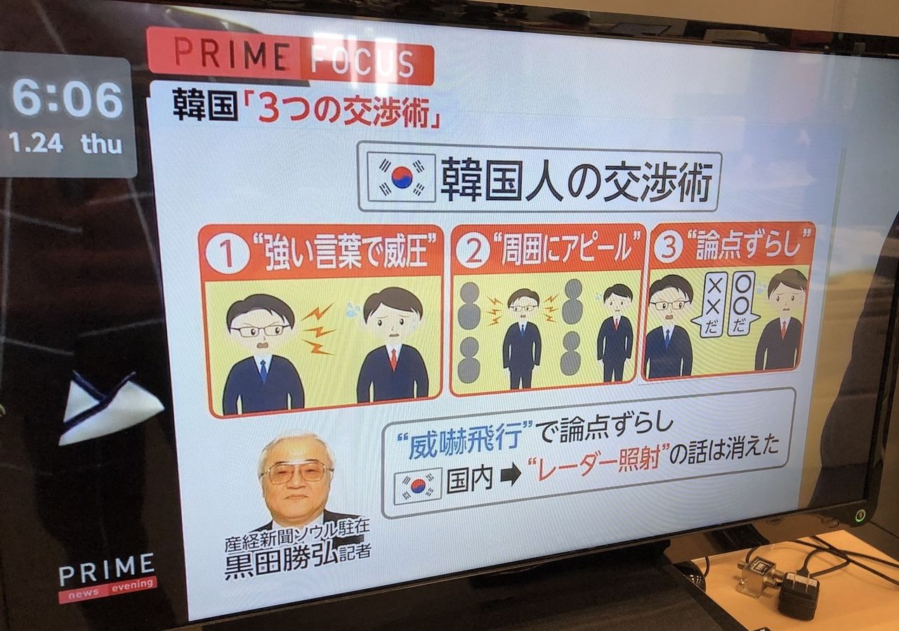 「韓国人の行動パターン、これが国にも当てはまるとは限りませんが、黒田さんは、たとえばレーダー照射に関して言えば、韓国政府は自衛隊機の低空での威嚇飛行を新たにポイントとして出すことによって論点をずらし、韓国国内ではいまやレーダーの話は消えたと、この3番目の戦術に当たるという風にしているんですね」