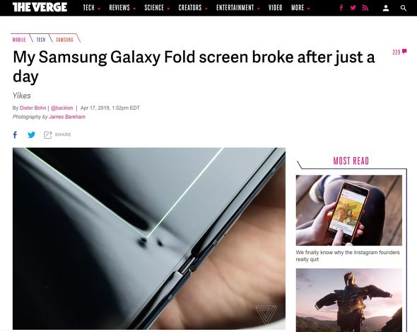 米The Vergeのディーター・ボーン記者は17日付の記事で、Samsungから提供されたレビュー機を使ったところ、1日で開いた状態のディスプレイの中央、下にヒンジがある部分に膨らみができたと報告。