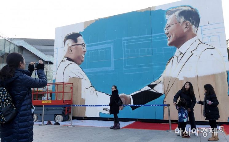 金正恩(キム・ジョンウン)北朝鮮国務委員長の年内ソウル答礼訪問可否に関心が集中している7日ソウル、鍾路区(チョンノグ)大統領府舎廊棟(サランチェ)の前庭に文在寅(ムン・ジェイン)大統領とキム委員長が握手する姿を描いた大型美術作品の前で市民が記念写真を撮っている.