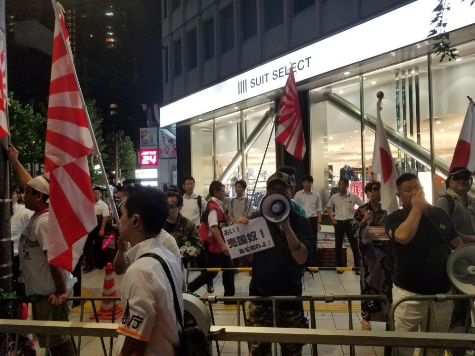 近くでは日本の右翼と見られる勢力が旭日旗を振り、「日本から出ていけ」と言うなど威嚇して、衝突を防ぐための警察兵力が大挙動員されました。