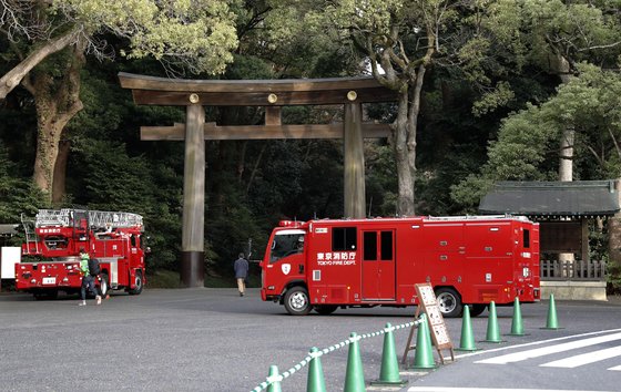 ▲18日午前、日本の主要神社の1つである明治神宮で火災が発生し消防車が神社前に止まっている。[聯合ニュース]