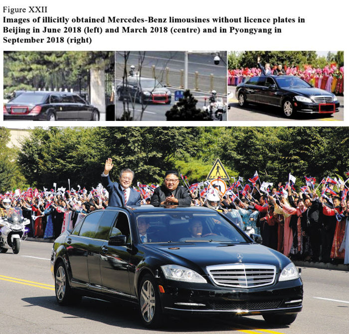 さらに文大統領が昨年9月18日に平壌で金正恩氏と共にベンツに乗ってパレードに参加した写真と共に、このベンツが昨年3月と6月に北京で使用された様子を写した2枚の写真も掲載した。制裁委員会はこれらの写真に「(北朝鮮が)違法に手に入れた、ナンバーのないメルセデス・ベンツ・リムジン」との説明を付している。