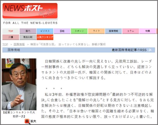 大前は日本有力週刊誌「週刊ポスト」最新版掲載のコラムで戦争慰安婦合意や強制徴用、レーダー問題などで悪化する韓日関係で日本は傍観すべきと主張しながら韓国をさげすむ表現を数回使った。
