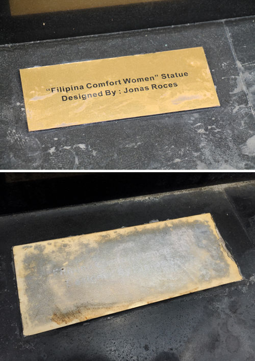 損傷されたのは、慰安婦像の台座部分の裏側にある「フィリピン人慰安婦の像: ジョナス・ロセスがデザイン」と英語で書かれた縦8センチ、横20センチほどの銅板で、化学薬品で溶かされたか、表面部分が削られたような状態になっている。2月末に訪れた日本人男性によると、この時点で、すでに傷付けられていたという。