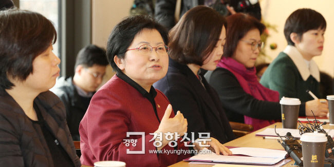 ▲発言するチョン・ヒョンベク女性家族部長官(左側2番目)。京郷新聞資料写真