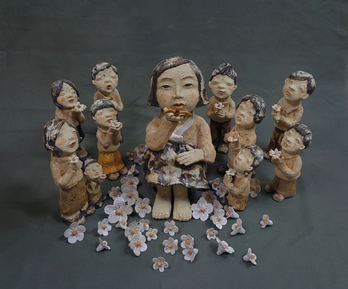 「ハルモニのほほ笑み」は、白いチョゴリ(女性用の朝鮮半島の伝統衣装)を着た少女が腕を天に向け広げてチョウなどを放つ姿が描かれている。肉体的、精神的に癒えない痛みを抱える中での一筋の希望を象徴する。
