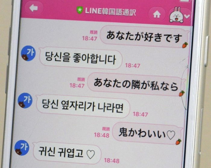 これはLINEが提供する、翻訳チャットウインドウの機能を活用するのである。該当のチャットルームにボーイフレンド、またはガールフレンドを誘い、言いたい言葉を書けばLINEが韓国語に翻訳した吹き出しを連続して出す方式である。