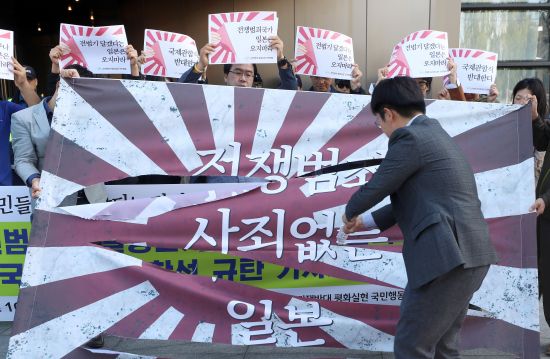 【ソウル=ニューシス】キム・ソンウン記者=戦争反対平和実現国民行動など市民団体が1日午後、ソウル鍾路区(チョンノグ)駐韓日本大使館前で記者会見を開いて済州(チェジュ)国際観艦式出席日本軍艦の戦犯旗(旭日旗)使用中止および日本帝国侵略戦争、「慰安婦」被害、強制徴用被害などについて謝罪を要求するパフォーマンスをしている。