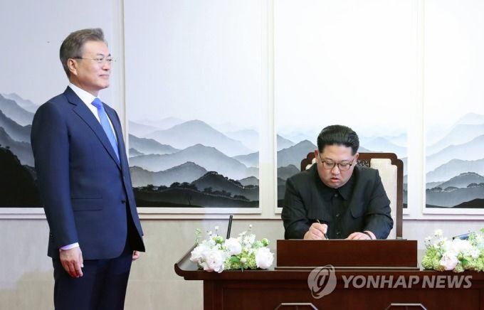 ■午前9時40分ごろ 北朝鮮の金正恩(キム・ジョンウン)委員長が韓国の文在寅(ムン・ジェイン)大統領とともに南北軍事境界線上の板門店の韓国側施設「平和の家」に入り、芳名録に「新しい歴史は今より。平和の時代、歴史の出発点で」と署名した。