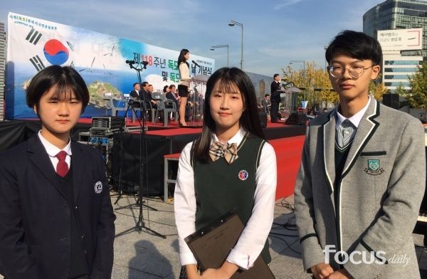 国興し運動本部とフォーカスデイリーの共同主催で25日、光化門広場で開かれた独島の日記念式と独島文化国民祭りでハナ高2年キム・スミン、培花(ペファ)女子高2年キム・ソンジン、狎鴎亭(アックジョン)中3年ムン・ジョンミン学生はこの日の行事場所で日本の学生に向けた手紙で雄壮に叫んだ。