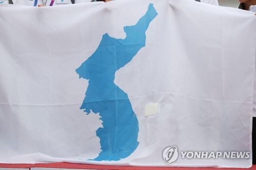 ▲今月26日、アジア大会カヌー傭船500m女子決勝で南北単一チームが初めて金メダルを取ったが授賞式に入場した選手団が持った韓半島旗で独島がテープで隠されている。[聯合ニュース資料写真]