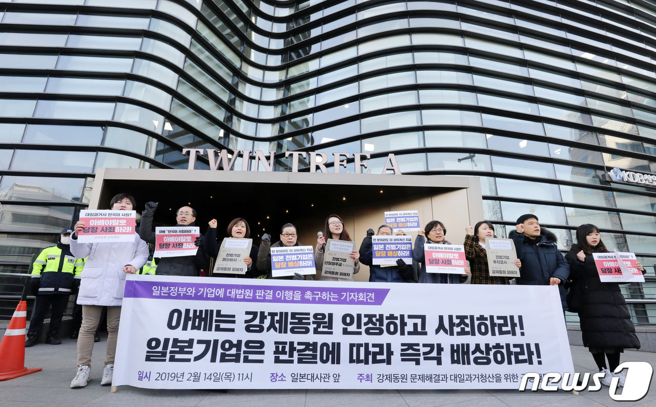 強制動員共同行動の会員らが14日午前、ソウル 鍾路区(チョンログ)の日本大使館(ツインツリータワー)前で、日本政府と企業に大法院(最高裁)判決の履行を求める記者会見を開いている。