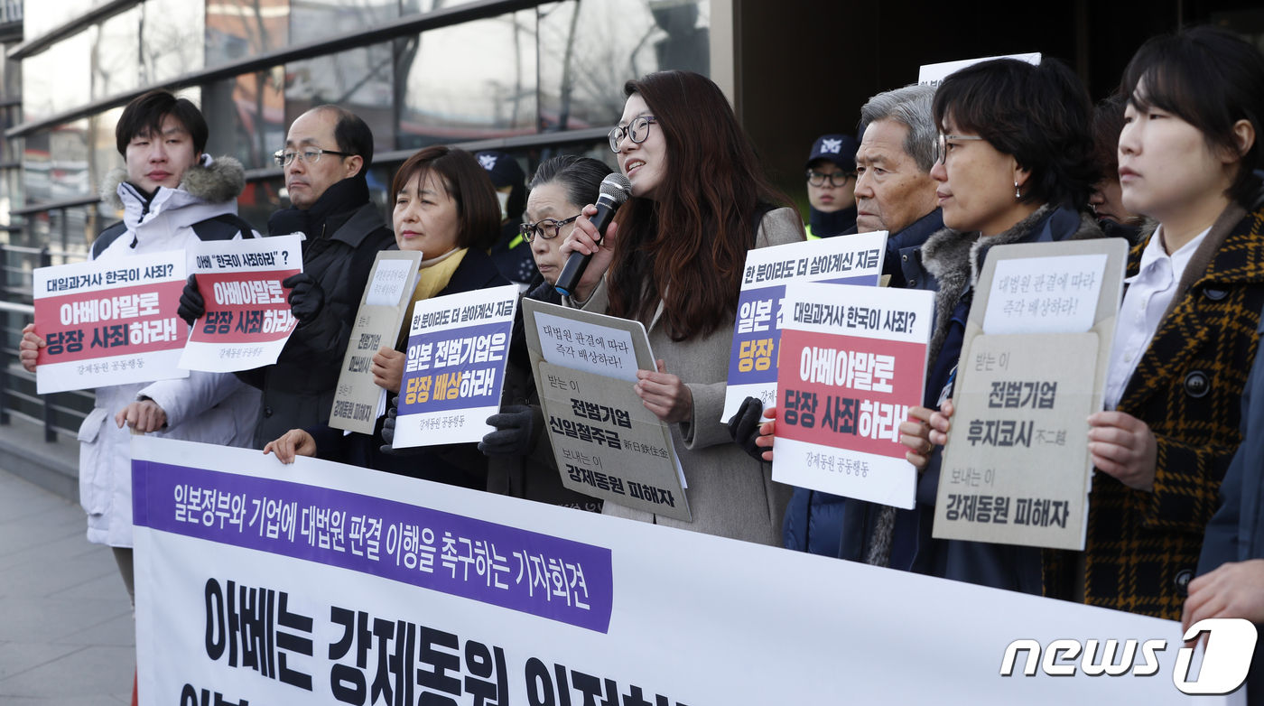 これらはこの日の記者会見を通じて、「新日鐵住金(シンイルチョルジュグム)、三菱(ミスビシ)、不二越(フジコシ)を相手にした強制動員訴訟で被害者が勝訴したが、日本政府の圧力と企業の判決移行拒否で被害者の苦痛が続いている」と明らかにして、大法院判決の早急な移行を求めた。