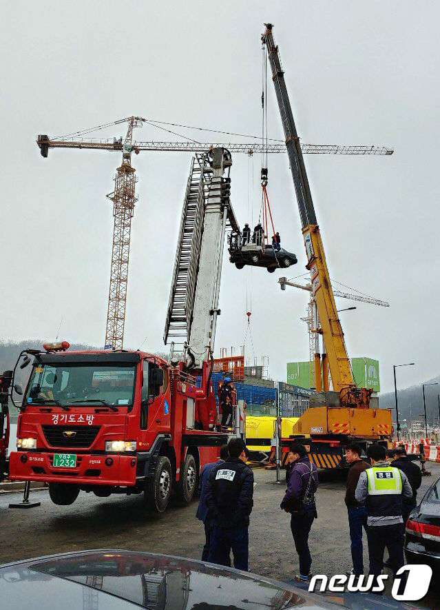 21日午前、京畿道(キョンギド)高陽市(コヤンシ)紙チュク(チチュク)地区のマンション建設現場で、未払い賃金の解決を求めて労働者3人が空中籠城をしている。